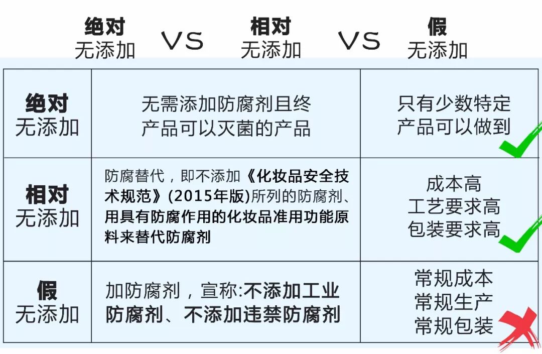 “无添加”势必会带来产品成本的严重上升,因为利用原料、包装、工艺、制造设备的升级改造去提升保质期、营养、功效的成本要远远高于使用添加剂的护肤品成本。所以市面上的无添加有以下三种:绝对无添加、相对无添加、假无添加。