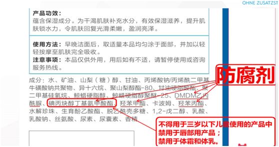 防腐剂种类很多,有些防腐剂的刺激性大,有些防腐剂的潜在风险大。《化妆品安全技术规范》(2015年版)所列的准用防腐剂有51种,其中很多防腐剂是有使用限定条件的,比如:碘丙炔醇丁基氨甲酸酯(IPBC)就不得用于三岁以下儿童、禁用于唇部、禁用于体霜。